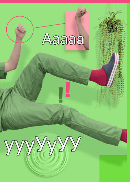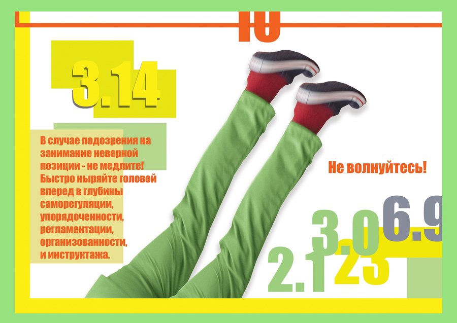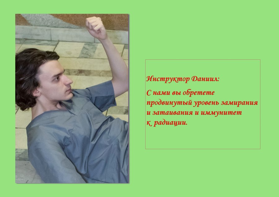 В серии фотографий «Школа Нулевого Вреда» я рассуждаю на тему инструкции как попытки стабилизировать, упорядочить жизнь. Я заставляю модель замирать в позах человечков с дорожных знаков и табличек «вход» и «выход». Упрощенность фигур на знаках затрудняет эту задачу и модель часто падает. Это создает зазор между реальностью и ее схемой, стабильностью и неустойчивостью, подчеркивая шаткость позиций избыточной регламентации.