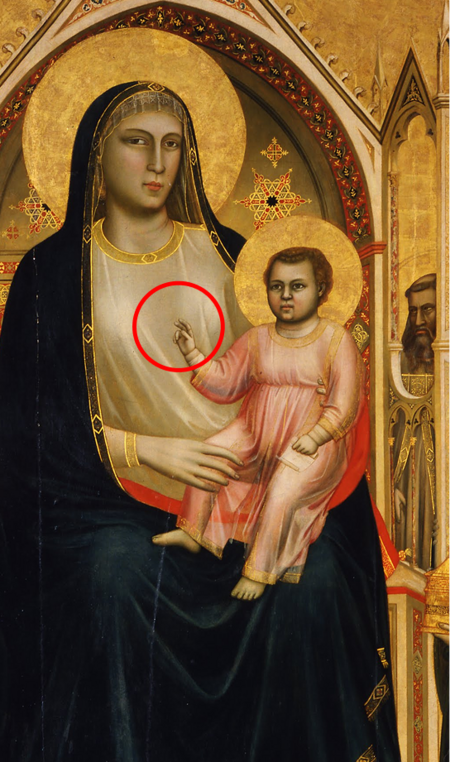 Обратите внимание: палец Младенца направлен на Марию — знак воплощения, а также утверждение её роли как «той, что указывает путь».