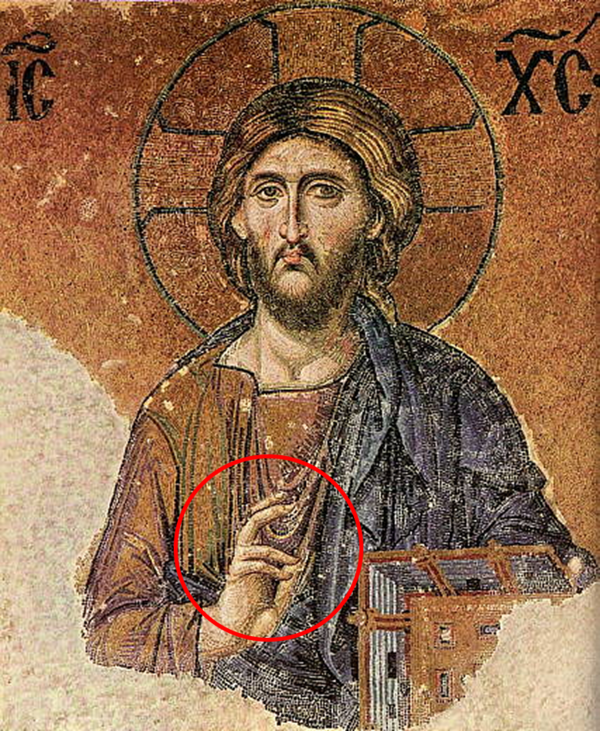 В византийских мозаиках жест указывает на совмещение божественной и человеческой природы Христа. В иконографии Пантократора жест часто направлен не в сторону, а вверх — как знак абсолютной истины и богословского учения.