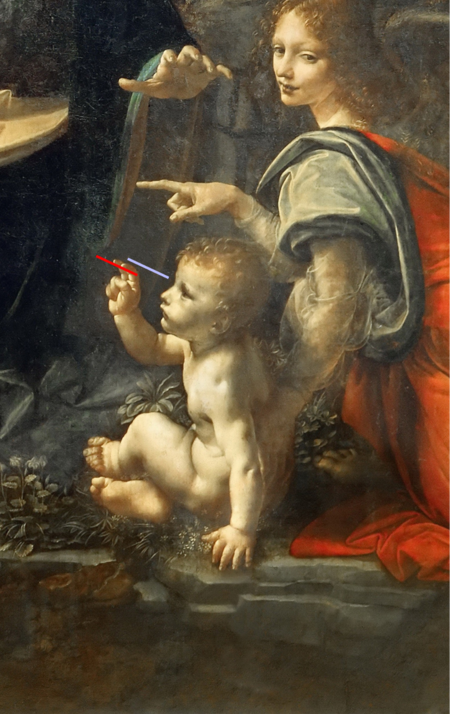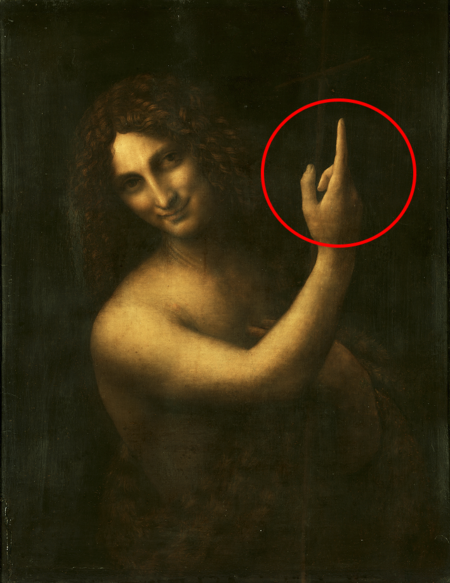 Здесь жест играет решающую роль: поднятый вверх палец, растворяющийся в мягком сфумато, направляет зрителя за пределы полотна. Он обращён к невидимому, к тайне. Свет моделирует руку так, что она оказывается самой яркой точкой композиции.