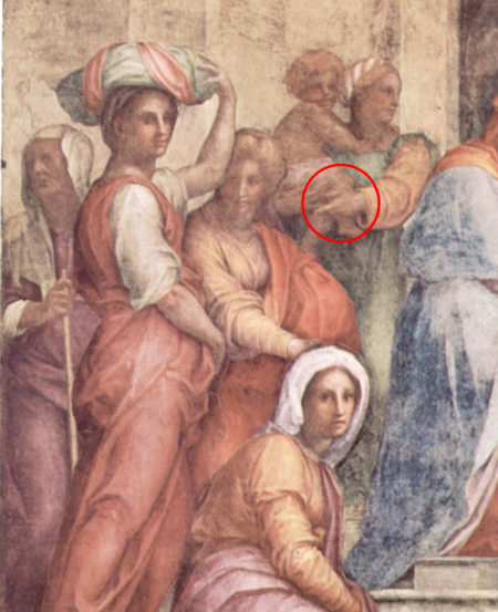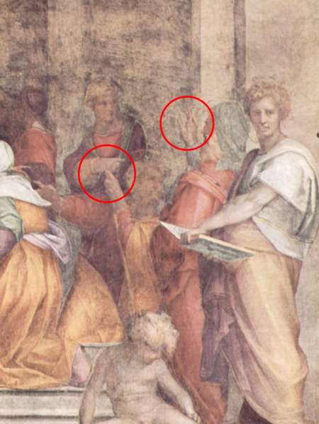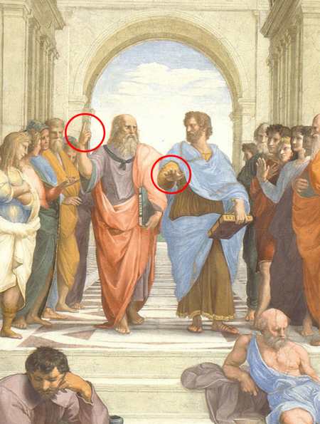 В «Афинской школе» Рафаэль использует жест указующего перста для передачи идеологической разницы между Платоном и Аристотелем.