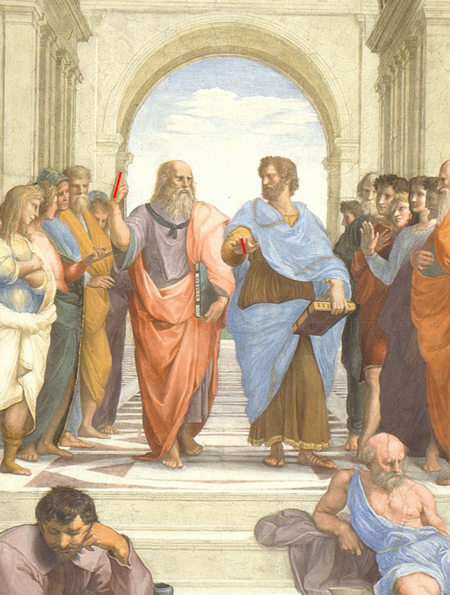 Платон указывает вверх — жест идеи. Аристотель указывает горизонтально — жест земной реальности.