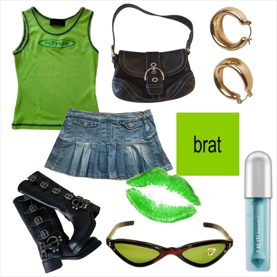 Визуально brat проявляется через: кислотно-зелёный, розовый, чёрный, серебристый; минималистичные, но агрессивные постеры и шрифты; макияж с «смазом», блестящую кожу, влажный эффект; челки, небрежные хвосты, слегка «грязный» гранжевый вид; короткие топы, мини-юбки, спортивные костюмы, большие серьги.