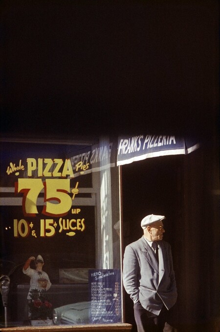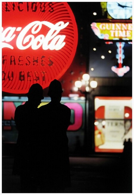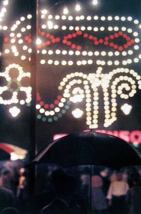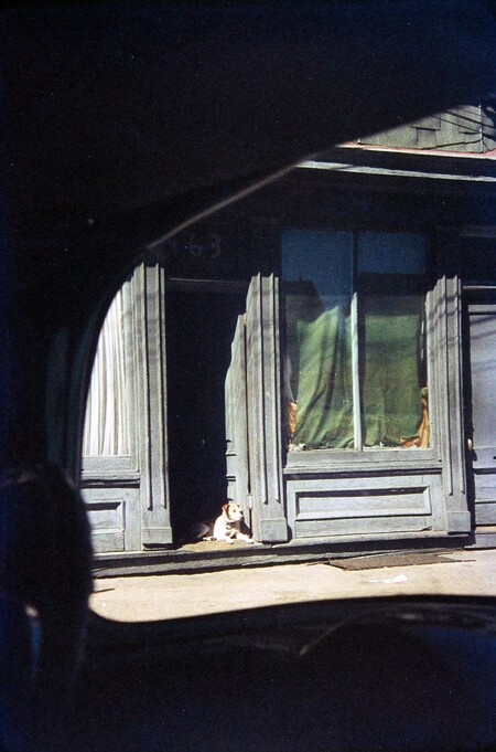 Лейтер действительно часто использует мягкие, спокойные цвета, которые создают атмосферу созерцательности: охру, винные красные, выцветшие синие, полупрозрачные серые. Такие кадры воспринимаются как интимные наблюдения за городом — будто фотограф делает шаг назад, позволяя зрителю почувствовать паузу, тишину, момент. Но рядом с этими спокойными сценами существуют снимки, построенные на ярких, насыщенных пятнах. Иногда эти элементы настолько интенсивны, что становятся главным эмоциональным импульсом кадра.