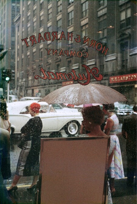 Ещё один значимый эффект — разделение изображения на плоскости. Витрина, в которой отражается улица, сама улица и пространство за витриной образуют три самостоятельных слоя. Иногда в каждом из них происходит своё маленькое событие, и вместе они создают многослойный визуальный рассказ. Но при этом Лейтер избегает перегруженности: стекло «собирает» слои в единую мягкую структуру, где всё важное — в ощущениях, а не в фактах.