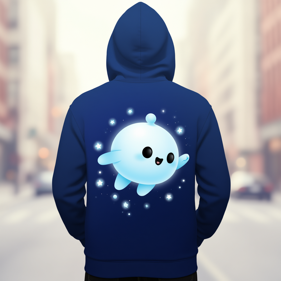 Для генерации толстовки я использовала нейросеть Qwen3-Max, используя картинку маскота как референс. Промпт — Сделай толстовку на человеке, на обратной стороне которой будет нарисован песронаж, такой же как на картинке, как будто летящий в сторону, он должен быть немного развернут в сторону и наклонен в сторону, в которую летит, вокруг него могут быть маленькие светящиеся шарики, как звездочки. Цвет толстовки — темно-синий или с градиентом из светло-голубого в темно-синий. На дальнем фоне позади человека пусть будет улица в светлом расфокусе, чтобы она не сливалась с толстовкой. У человека должна быть видно только тело, плечи и руки, мы не видим его головы или ног. https://chat.qwen.ai/