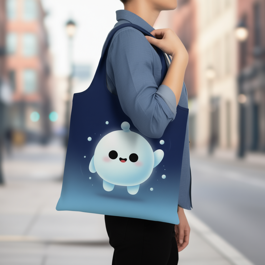 Для генерации шоппера использовалась нейросеть Nano Banana. Prompt — Make a shopper in a realistic design, which will depict a character from the image, do not change its main shape. He should smile and wave his hand as if to say hello. At the top edge of the bag, you can write the inscription Somnix in small letters in the Dodo Variable font. The colour of the bag should be plain dark blue or with a slight gradient from light blue to dark blue. Small glowing balls can fly around the character like stars. Далее я доработала картинку с помощью нейросети Qwen3-Max Промпт — помести эту сумку как бы на плечо человека, который стоит. Не видно лица и ног человека, только его плечо, на котором находится сумка. Добавь на задний фон улицу в светлом расфокусе, чтобы было ощущение, что человек куда-то идет и чтобы сумка не сливалась по цвету с фоном. https://unitool.ai/ru/nanobanana