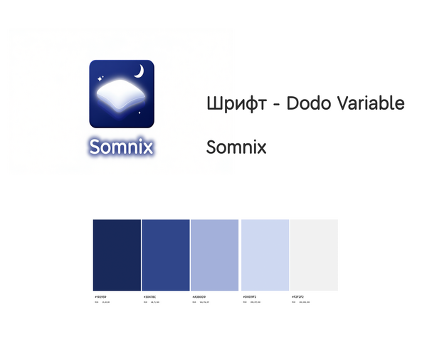 Для генерации промпта для создания общего стиля интерфейса я использовала нейросеть Qwen3-Max. Промпт — создай промпт для генерации интерфейса приложения Somnix для восстановления режима сна. Используй цвета такие же как на картинке (палитра цветов на картинке создана с помощью сайта Adobe Color после загрузки в него логотипа).