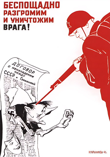 Данная группа военных плакатов всего периода имела цель поднять боевой дух через высмеивание противника и формирование образа абсолютного зла. Их целевая аудитория: всё население страны — как фронтовики, так и мирные жители.