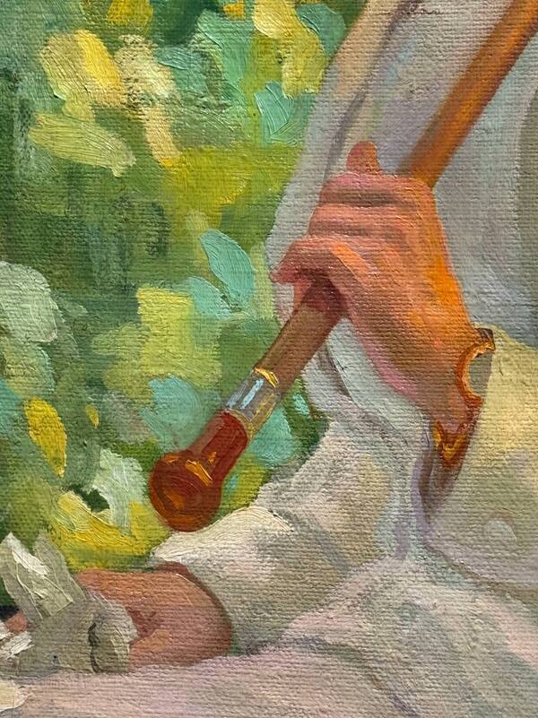Художник своей игрой света и цвета акцентирует утончённые и благородные черты лица модели и её непринуждённую позу. Яркими красками и контрастами цветов он прекрасно изобразил летнюю прогулку в солнечный день