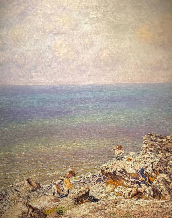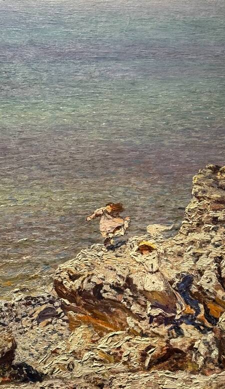 Благодаря короткому и быстрому мазку создаётся ощущение динамичности и воздушности. Несмотря на не особо контрастные оттенки, которые используются для скал и фигур людей, зритель четко отличает, где что находится и это происходит именно из-за техники мазка, которой работает художник.