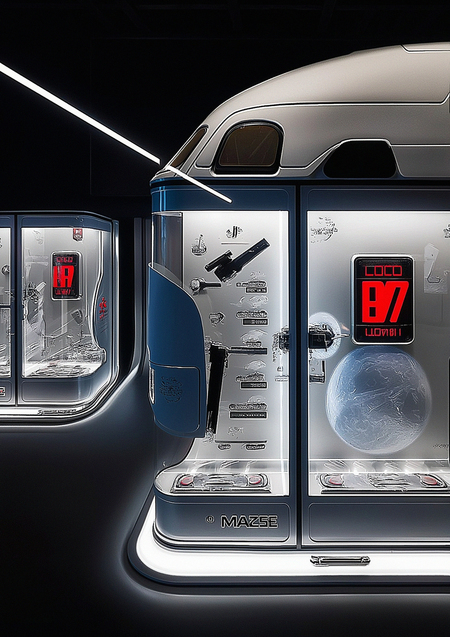 interior of «AURA» concept store, spaceship bridge aesthetic. Modular product display stands integrated into walls like control panels and technical bays. Sleek aluminum racks with built-in cyan LED lighting, holographic product information displays. Materials: brushed metal, matte black composite, glowing acrylic panels. Lighting: immersive blue ambient glow with precise spotlights. Style: sci-fi industrial design, clean and functional. Photorealistic, Unreal Engine 5, wide-angle lens --style raw