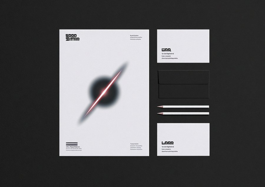 stationery mockup of letterhead set for «AURA» brand, cosmic corporate identity. Featuring elegant envelope with embossed logo, matching writing paper with minimalist header showing star constellation pattern. Materials: heavy cotton paper, deep navy blue and silver. Arranged in a flat lay with a metallic pen, natural lighting from side