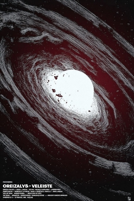 A series of 90s grunge-style concert posters, «AURA» brand cosmic edition. Design features: dynamic space explosion with thin rings and tiny planets, drawn with ink splatters and rough textures. Color scheme: stark black and white with cold neon red glowing accents. Stylistic elements: photocopy degradation, tape strips, rough typography with words «ORBIT», «ESCAPE VELOCITY», «ZERO GRAVITY». Style: hand-drawn zine aesthetic, vintage Xerox art, muted palette with vibrant red highlights --ar 2:3 --style raw