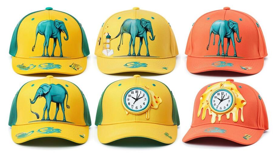 Промт для 2 изображения: Создай кепки-мерч в стиле картин Сальвадора Дали. Пусть кепки будут выполнены в желтых и коралловых оттенках и на них будут значки слонов и часов. Добавь еще бирюзового в предметах
