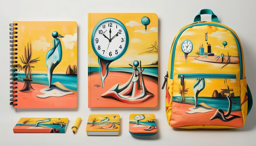 Промт для 1 изображения: Создай школьные принадлежности в стиле картин Сальвадора Дали. Пусть принадлежности будут выполнены в желтых и коралловых оттенках. Добавь еще бирюзового в предметах