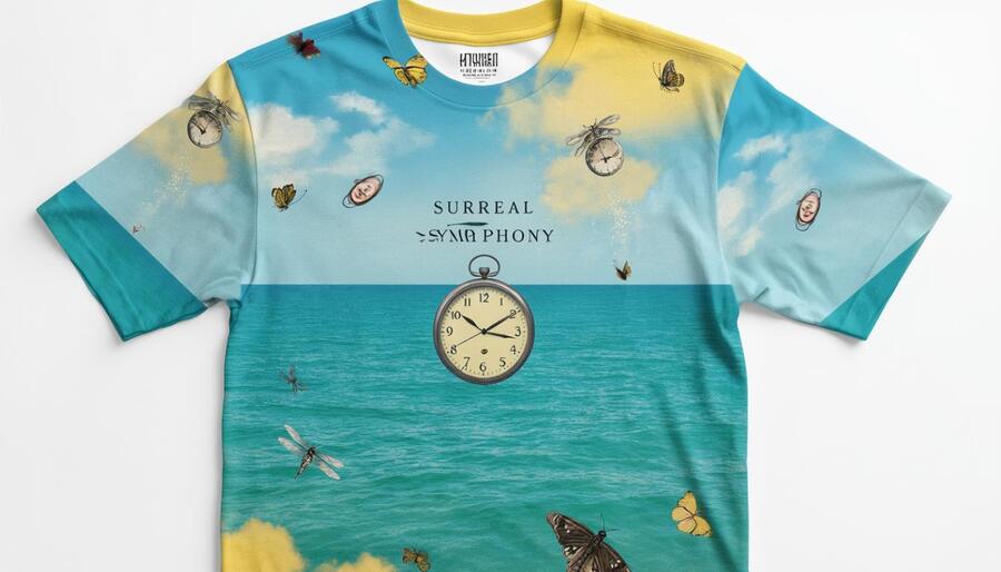 Промт для 3 изображения: Создай футболку-мерч в стиле картин Сальвадора Дали в стиле SURREAL SYMPHONY. Пусть футболка будет выполнена в бирюзовых и желтых оттенках. Сама футболка пусть лежит на белом фоне