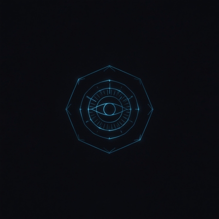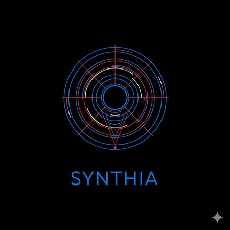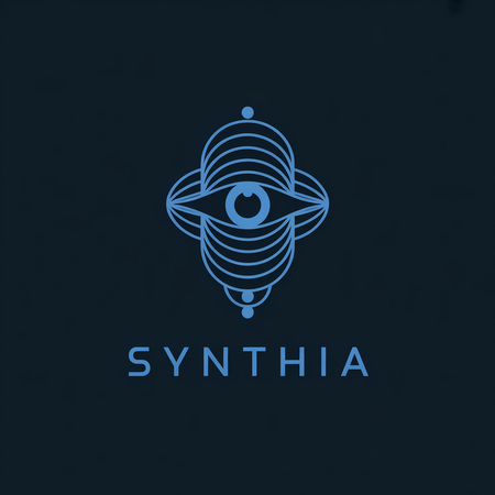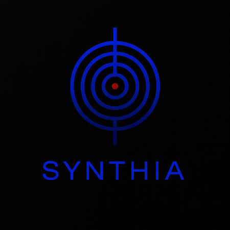 Промт: Design a minimalist geometric logo for SYNTHIA, an immersive museum visualizing the nine circles of hell through artificial intelligence. The logo should feel mysterious, digital, and sacred — blending technology and mysticism. The symbol should be abstract and symmetrical: think of a fusion between a digital eye, a portal, and nine concentric layers representing descent into the subconscious. Typography: clean, futuristic sans-serif with subtle spacing; use uppercase «SYNTHIA». The text should feel refined and balanced, not aggressive. Color palette: deep black background, electric blue (#0017EA) as the primary accent, with optional touches of dark red or metallic silver. No 3D, no gradients — only flat design and strong symbolism.