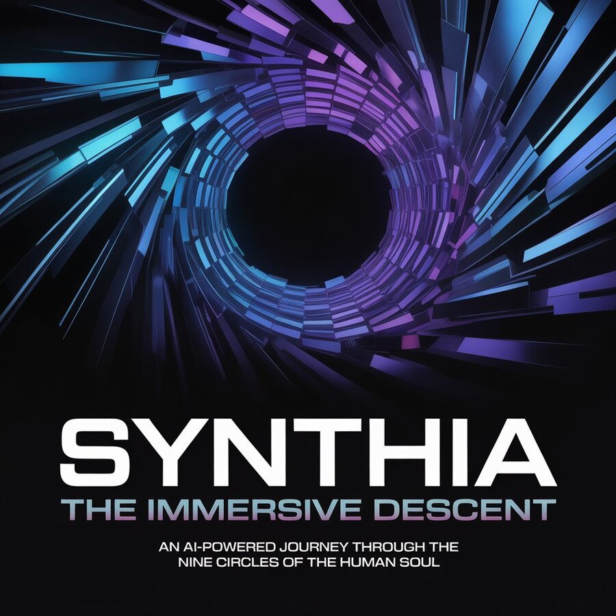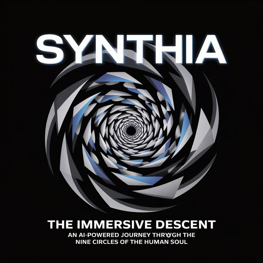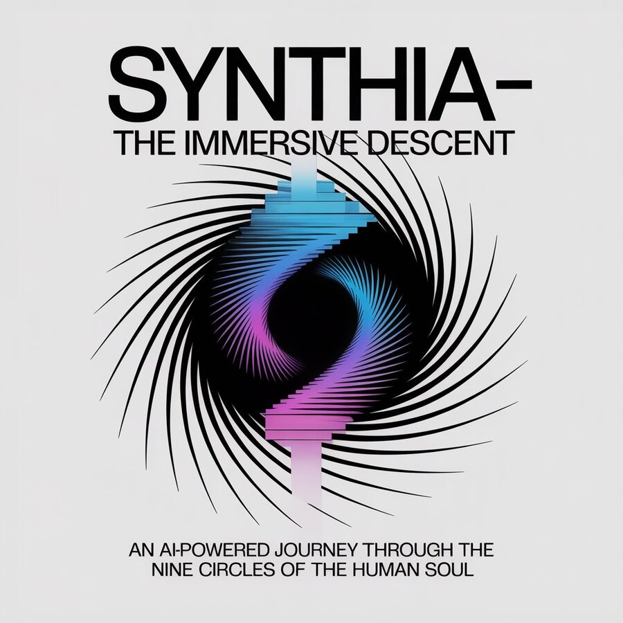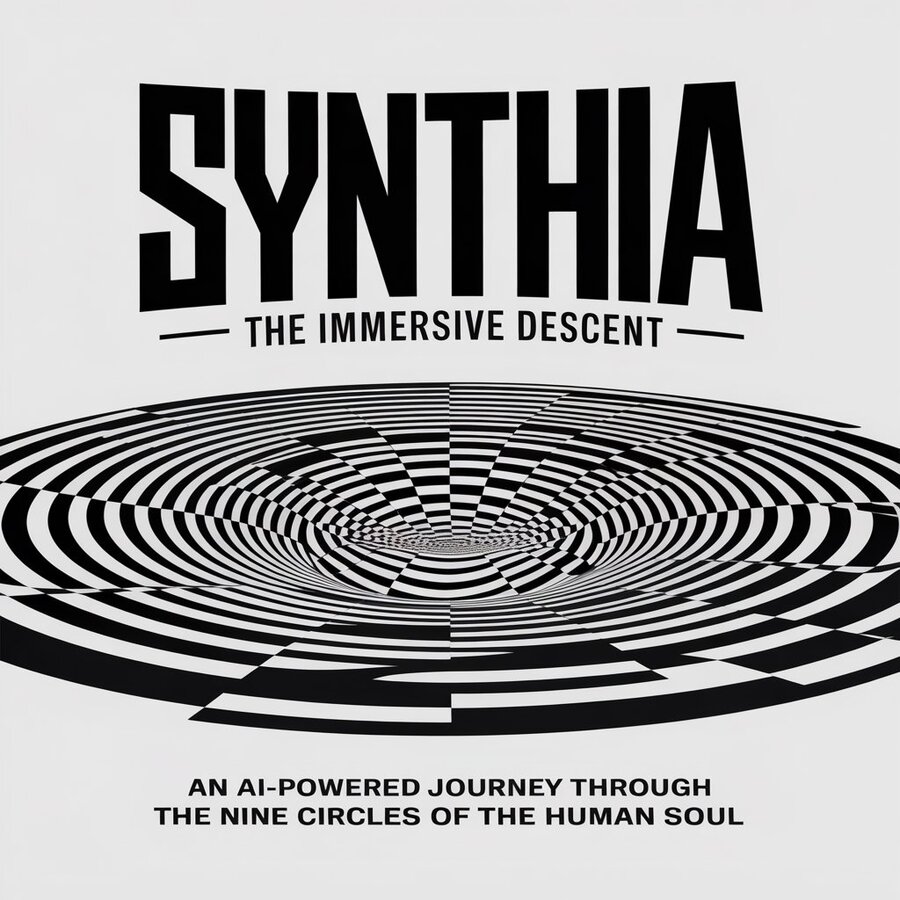 Промт: Large-format event poster for SYNTHIA — The Immersive Descent. Central geometric shape (portal, spiral, or digital vortex) draws the viewer inward. Include event info: «An AI-powered journey through the nine circles of the human soul.» Style: graphic minimalism, futuristic typography, high contrast, flat composition