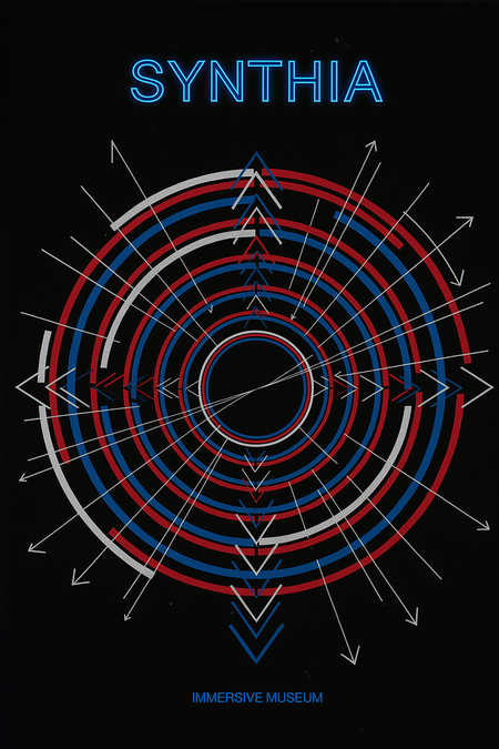 Промт для обложки: Minimalist flat graphic poster design for the project SYNTHIA — an immersive museum visualizing the nine circles of hell through digital intelligence. Create a geometric, symbolic composition using abstract shapes: concentric circles, fragmented grids, and lines suggesting descent and transformation. The layout should feel clean, futuristic, and mysterious. Use a dark background (deep black) with accent colors — electric blue (#0017EA), crimson red, and metallic silver. Add minimal noise or subtle texture for depth. The central motif should symbolize a digital portal or abstract descent — nine stylized rings or layers forming a tunnel-like structure. Typography: «SYNTHIA» in a refined, modern sans-serif with tight spacing, uppercase, slightly glowing or outlined.