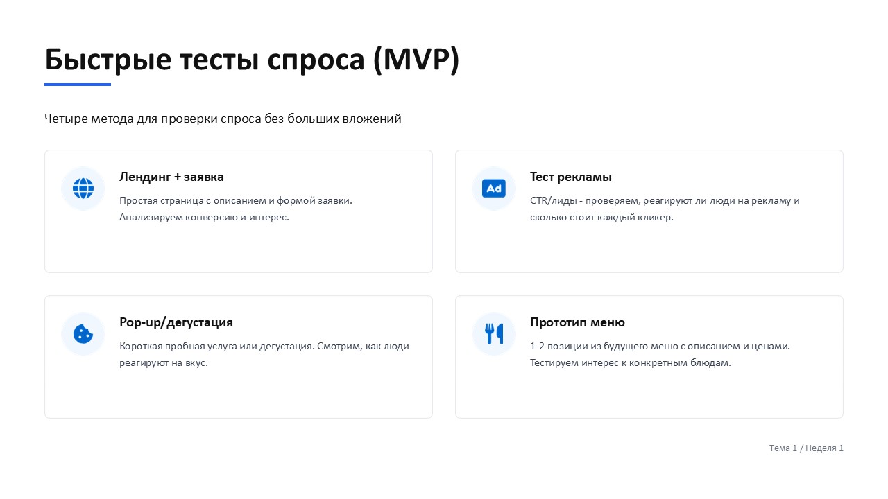 Эта неделя — старт курса и самый важный фильтр всего проекта. Мы не начинаем с выбора названия, меню или красивого интерьера. Мы начинаем с того, что ищем сильную бизнес-идею, проверяем, есть ли под неё живой спрос, и прикидываем, может ли она зарабатывать.