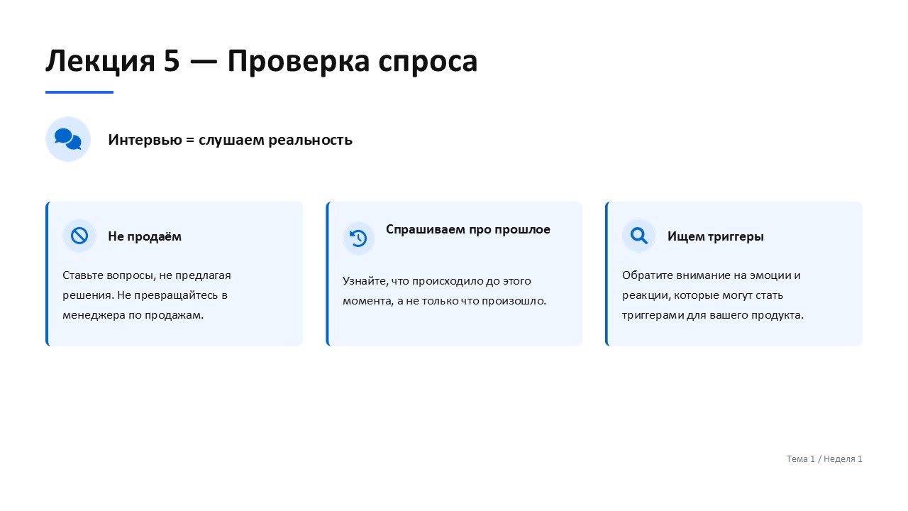 Лучше не тянуть: чем быстрее ты выйдешь в интервью, тем быстрее станет ясно, рабочая ли идея. Если чувствуешь, что интервью «сыпят» идею — это хорошо: дешевле поменять гипотезу сейчас, чем после ремонта и закупок.