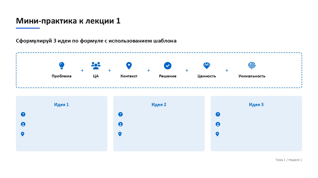 Мини-практика Ты формулируешь 3 идеи по шаблону. Это нужно, чтобы не застревать на первой мысли и не влюбляться в нее вслепую. Дальше мы их сравним и выберем сильнейшую.