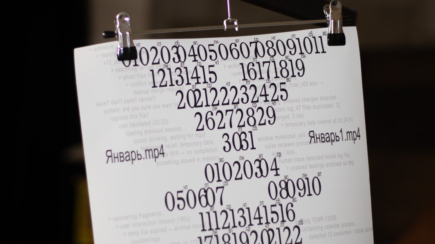 Календарь исследует феномен цифрового шума, которое превращается в паттерн. На экране всё накладывается друг на друга. Систематичность машины сталкивается с человеческой органикой, создавая беспорядок, который издалека кажется структурой. TEMP://2026 фиксирует эти полупрозрачные следы: временные файлы, терминальные процессы, и сверху цифровой код, подсбившийся в своём ритме. Проект становится метафорой постоянного накопления и стирания данных, где попытка упорядочить пространство рождает новый шум.
