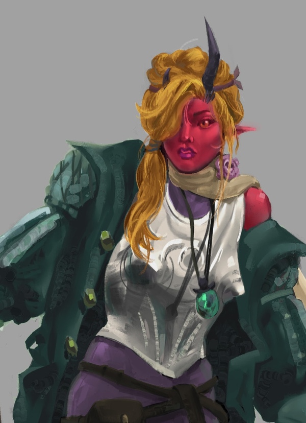 Как уже было сказано, у тифлингов кожа часто неестественного цвета, а конкретно у Тони она ярко-красная. Это сложный цвет, так что моей главной задачей было собрать уравновешивающую палитру. Кроме того, было важно сохранить гармоничность и разнообразие, потому что Тоня следит за своим гардеробом и предпочитает выглядеть стильно и заметно. Да, даже в драке с гоблинами.
