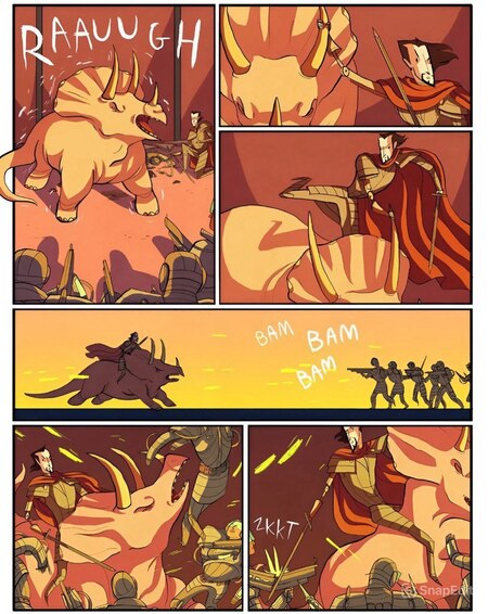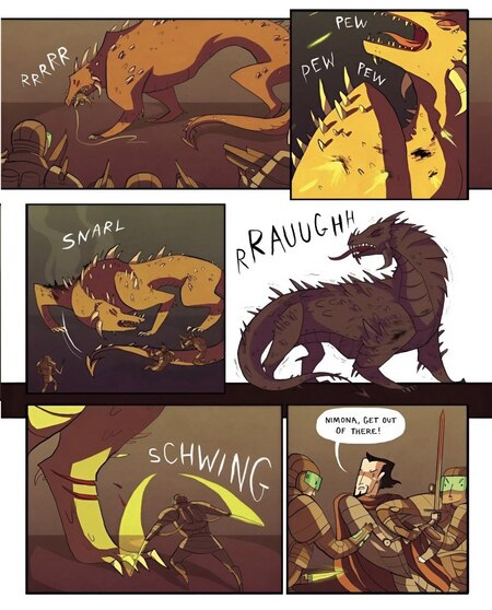 Теплый и мягкий красный фигурирует в спокойных сценах; Насыщенный и яростный красный — в моменты гнева или во время яростных споров; Темнеет и «загустевает», когда она становится монстром. Цвет буквально подсказывает нам, читателю, что Нимона перестает контролировать себя, своего внутреннего монстра. Чем ярче красный — тем острее ее внутренний конфликт.