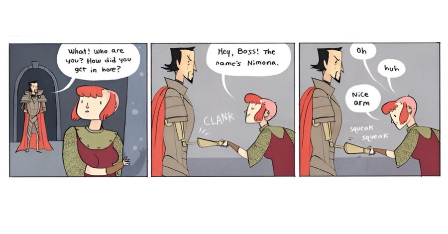 Особенно это заметно, когда трансформация происходит на глазах. В сценах, где Нимона переходит от человеческой фигуры к звериной, насыщенность увеличивается, создавая ощущение резкого движения или перехода от одной сцены к другой. Цвет в комиксе работает почти как эмоциональная температура. У Нимоны есть постоянный визуальный маркер — красный.