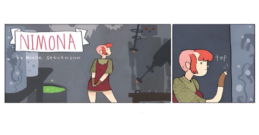 Одним из таких произведений стала «Нимона» (выпущенная в 2015) Н. Д. Стивенсон. Это комикс выделяется среди остальных своим необычным жанровым сочетанием рыцарской эстетики, магии и высоких технологий — средневековье с компьютерами и лабораториями (жанр схож со стимпанком, но город, все же, менее продвинутый). А также и особым отношением к теме самоидентичности и влиянию общества на нее. Центральной героиней выступает маленькая дерзая беспризорница по имени Нимона, которая обладает способностью менять форму своего тела, как душе угодно. Именно эта её особенность определяет большую часть визуального языка произведения.