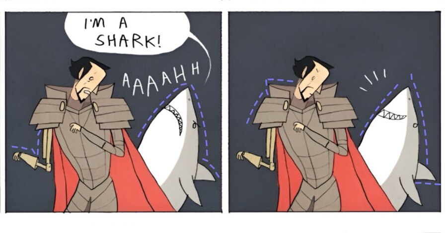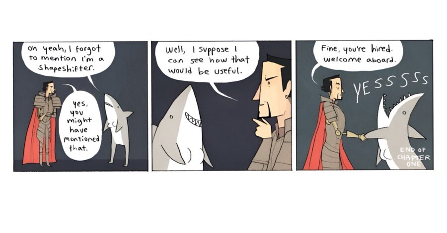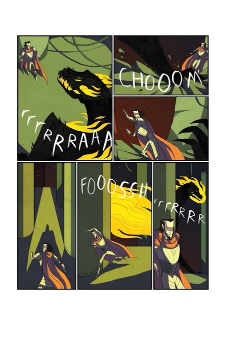 Когда она демонстрирует свою способность к превращению, становясь акулой, композиция становится более стабильной, так как Нимона становится схожим по массе силуэтом, как и Блэкхарт. Уже здесь становится заметным главный визуальный принцип комикса: Нимона всегда тянет на себя одеяло структуры мира и фреймов своим присутствием.