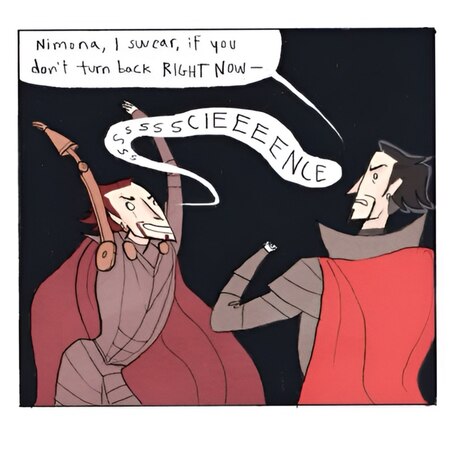 Сама способность Нимоны к превращению — это визуальная метафора её внутренней нестабильности, попыток примирить разные стороны своей личности и одновременно — её одиночества. Она постоянно меняет облик, потому что внутри не чувствует себя цельной и единой личностью. Будто бы она пытается затеряться в этих образах, тем самым убегая от «истинной себя». Это видно начиная с первых сцен: даже мелкие трансформации — смена размера, превращение в волка, маленьких животных — подаются читателю как естественная часть её речи, будто она не отделяет свою личность от способности менять форму.
