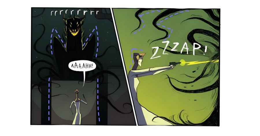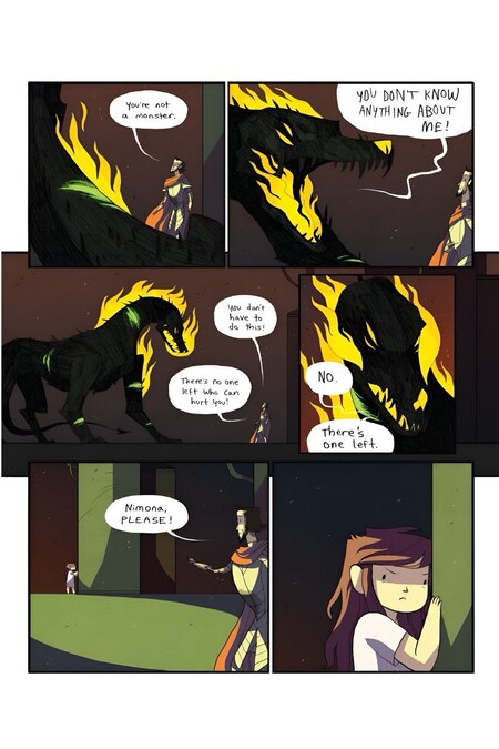 Когда Нимона теряет контроль, и её форма становится слишком большой или слишком аморфной, композиция буквально разрушается: панели могут рваться, исчезать, выталкиваться огромной массой её тела. Художник показывает, что хаос не умещается в структуру — и это конфликт не только сюжетный, но и формальный.
