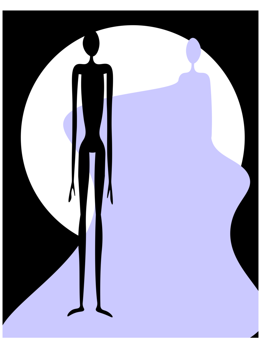 Черная фигура мужчины статичная, заметная, женская же выполнена в более нежных тонах и обтекаема по своей форме. Белый круг на фоне выражает единение этих начал.