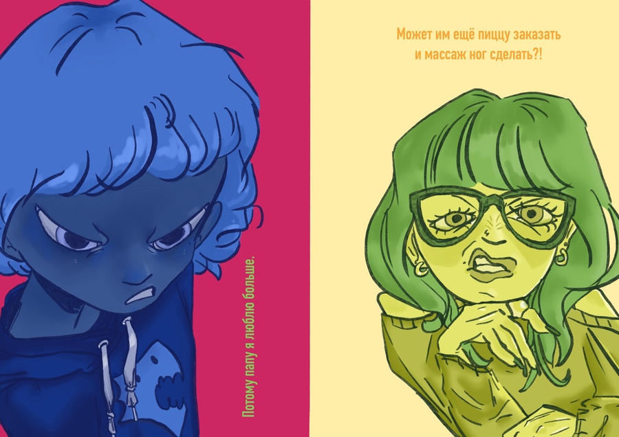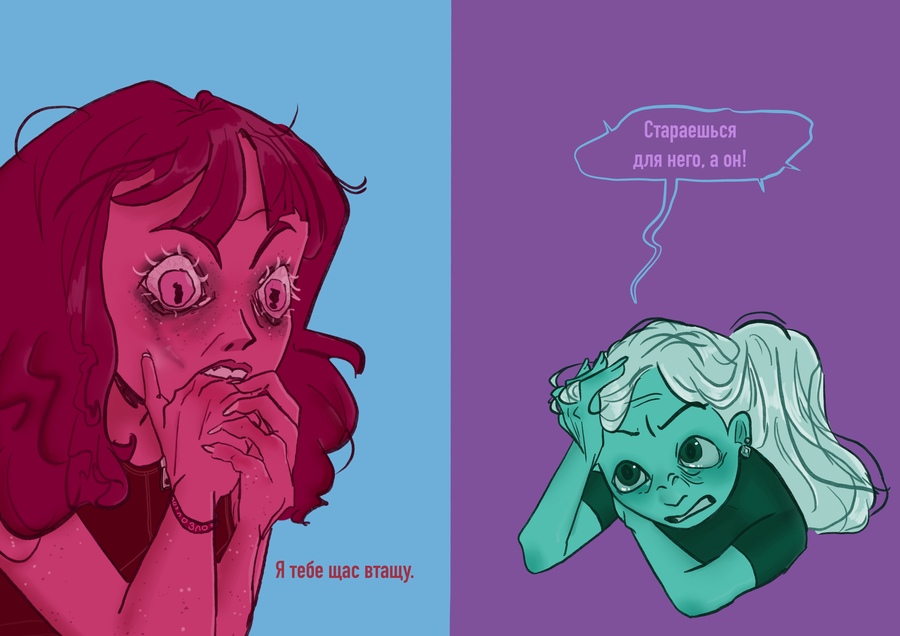 В своём зине я проиллюстрировала людей, с различными спектрами раздражения, агрессии и истерии. С каждым разворотом герои становятся всё эмоциональнее, доходя до точки кипения, пока гнев окончательно не иссякнет. И всё, что останется, сидеть и приходить в себя.