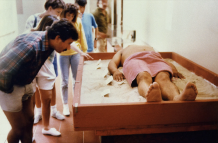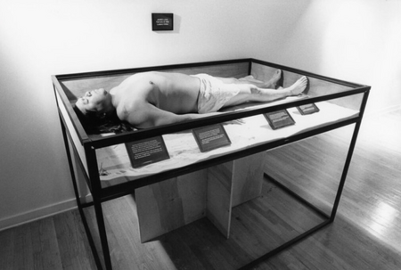 Луна лежал в витрине полуобнажённым, а среди него был усыпан песок и личные вещи художника: книги, документы о разводе, фотографии, предметы индейской медицины и даже бумажки с описанием его шрамов.