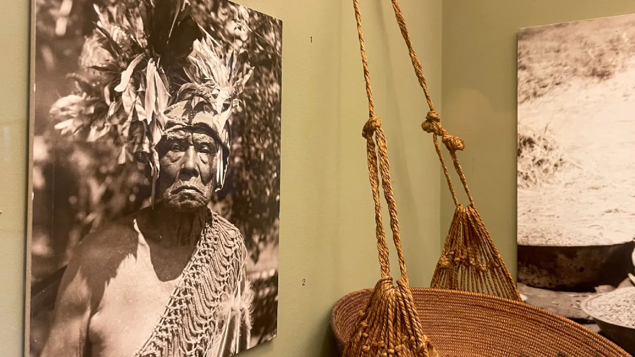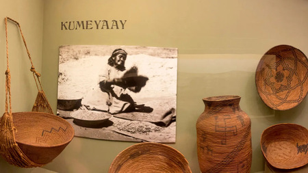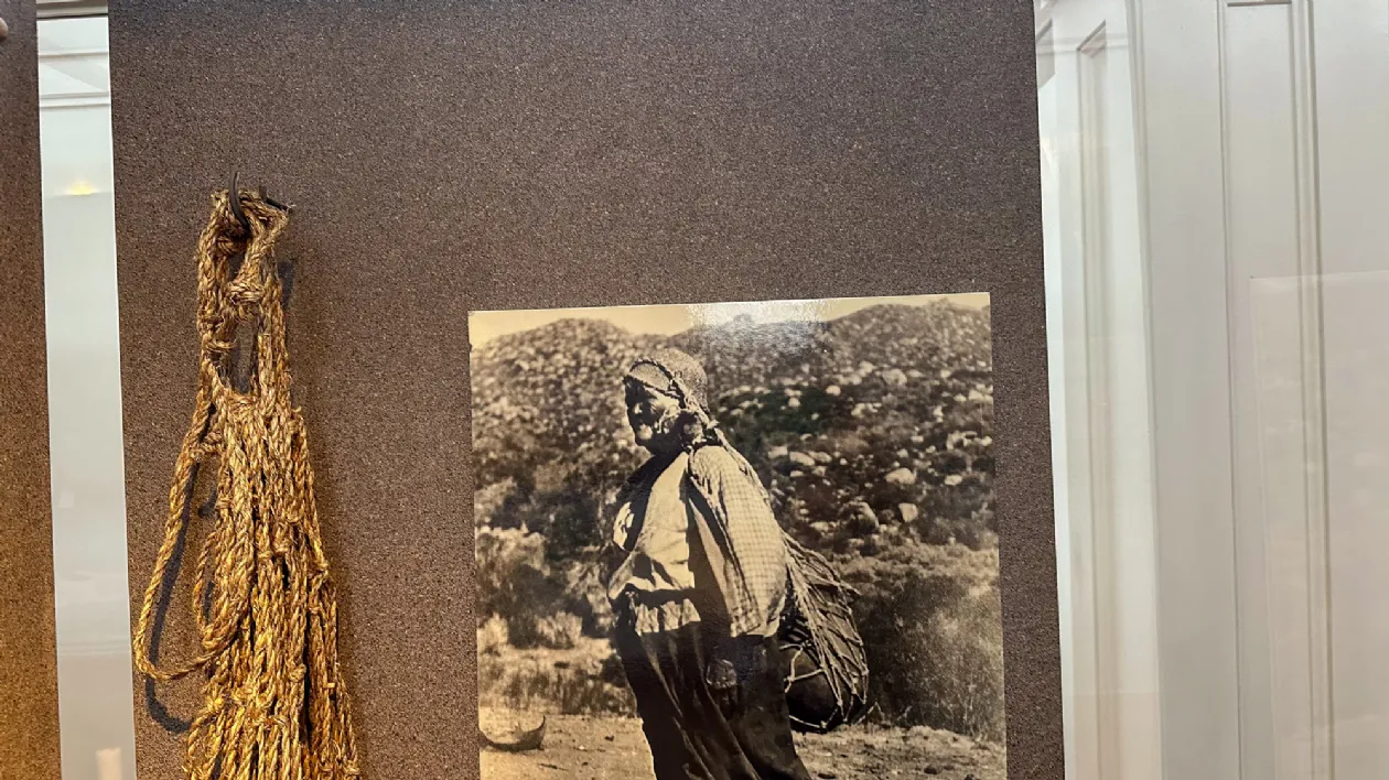 Справа: Фотография женщины племени Кумеяй (XVIII), Музей «Нас» Слева: Корзина племени Кумеяй (XVIII), Музей «Нас»