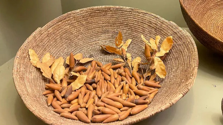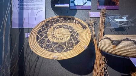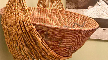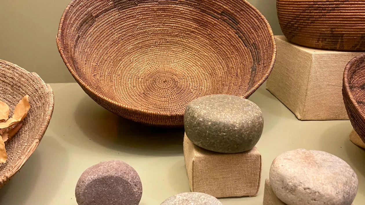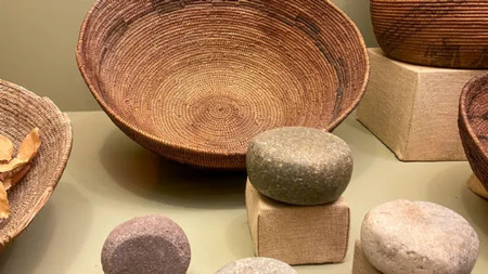 Справа: Различные инструменты племени Кумеяй (XVIII), Музей «Нас» Слева: Корзина для сбора зерна и семян племени Кумеяй (XVIII), Музей «Нас»