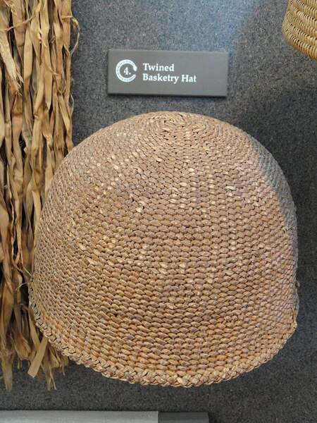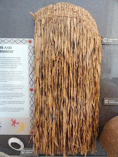 Справа: Плетеная шляпа племени Кумеяй (XVIII), Музей «Нас» Слева: Юбка из ивовой коры Кумеяй (XVIII), Музей «Нас»
