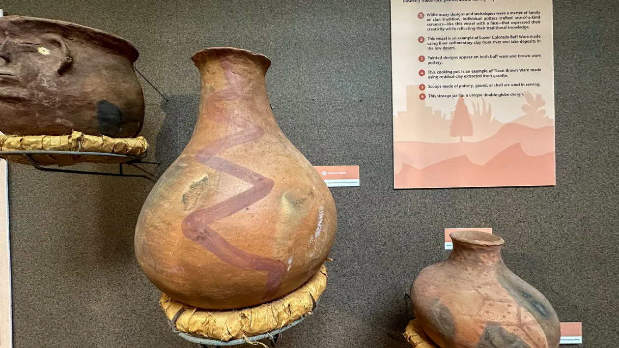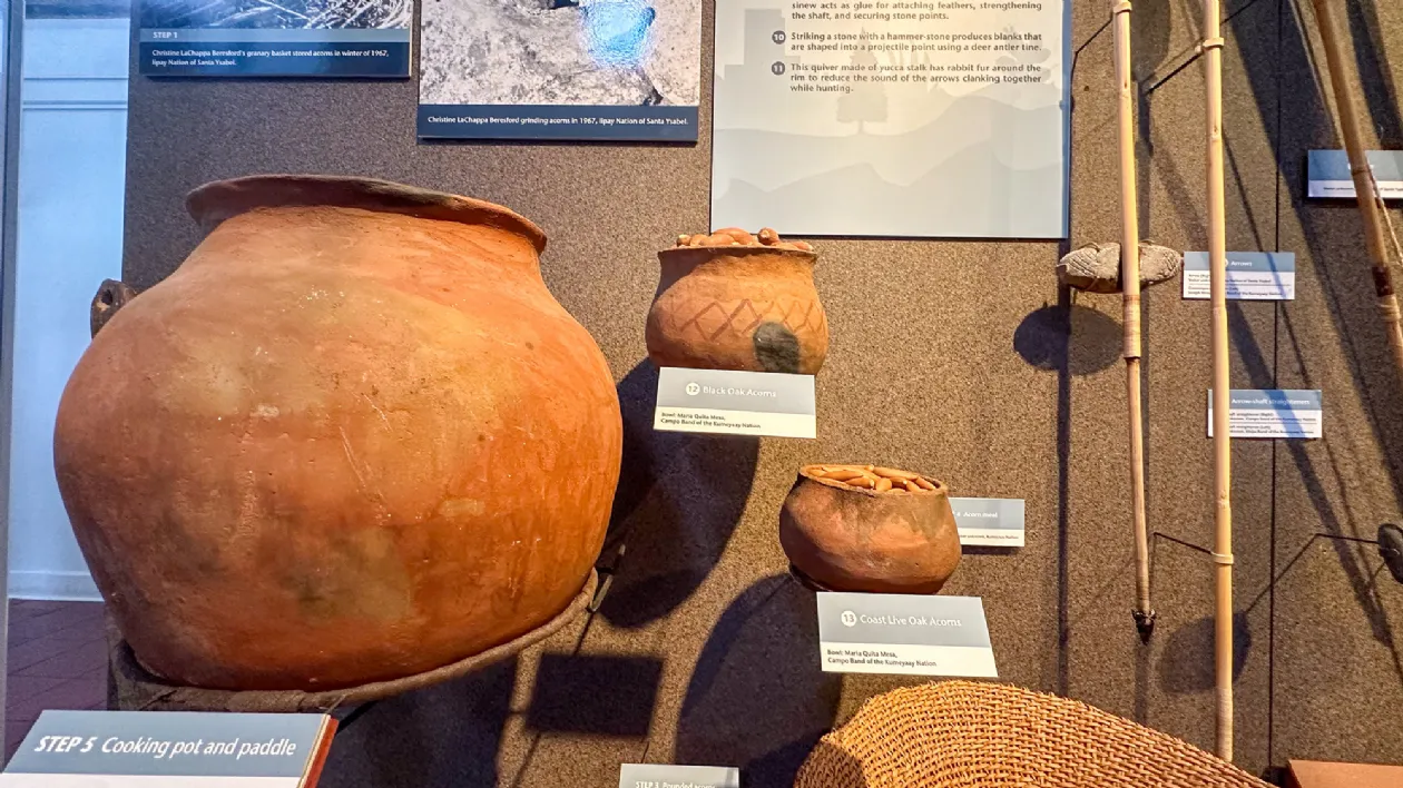 Справа: Ваза для приготовления пищи племени Кумеяй (XVIII), Музей «Нас» Слева: Посуда для сбора желудей племени Кумеяй (XVIII), Музей «Нас»