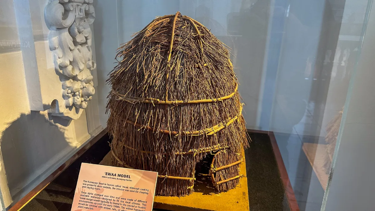 Справа: Дом-ива племени Кумейяай (XVIII), Музей «Нас» Слева: Корзина для сбора различных предметов Кумейяай (XVIII), Музей «Нас»