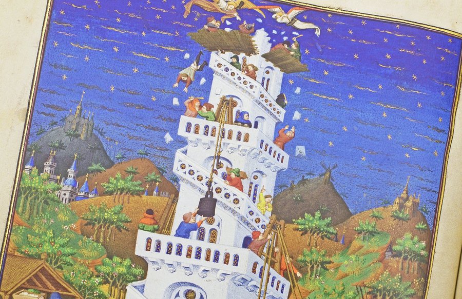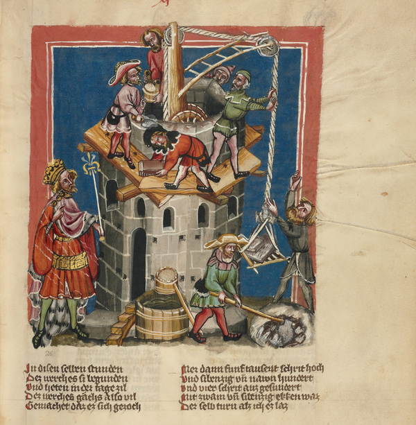 В книжной миниатюре конца XIII–XIV вв. сюжет развивается детальнее: например, в германской «Мировой хронике» (Weltchronik, ок. 1400) изображён стройплощадка с башней. Царь Нимрод (традиционно приписываемый строительству башни) стоит слева и контролирует работы, а рабочие на лесах с помощью блоков и лебёдок поднимают кирпичи на верхние ярусы.В таких миниатюрах подчёркивается процесс возведения: видно работу каменщиков и изготовление кирпича. В «Часах герцога Бедфорда» (Париж, 1-я четверть XV в.) мастер Бедфорда создал особенно известное изображение: оно отличается тщательной архитектурной проработкой и масштабностью, став «эталонным» изображением башни, знаменитым и в наши дни. Таким образом, уже в средневековых рукописях Вавилонская башня показана как грандиозная стройка с множеством участников и сложными механизмами строительства.