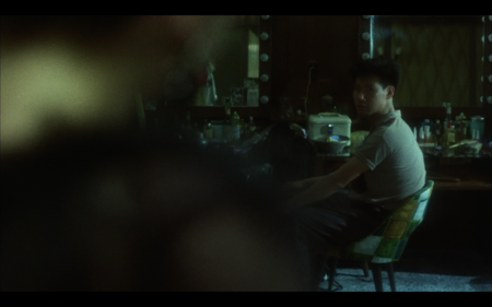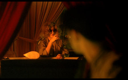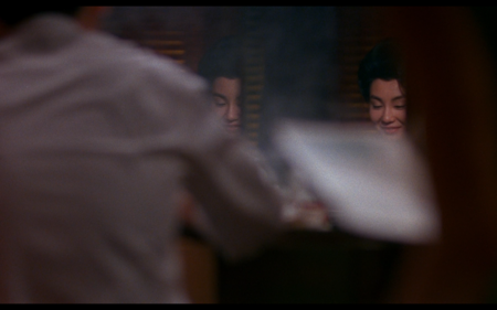 Карвай часто совмещает в одном кадре несколько визуальных приемов. Нельзя не отметить, что в кадре выше, помимо наложения планов, также используются: сокрытие лица, внутренний кадр со стесняющими рамками, отражение (подробнее эти приемы рассматриваются в соответствующих главах).