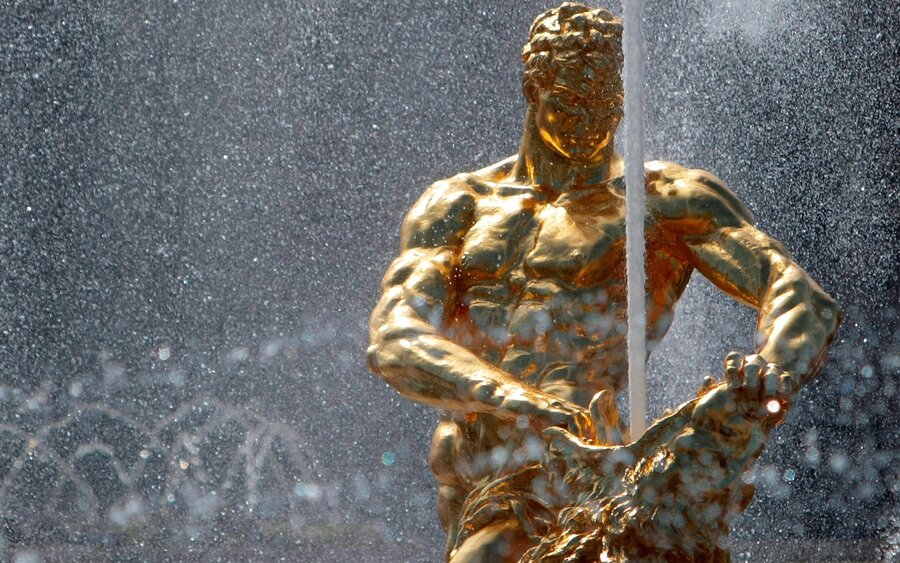 Лев — символ Швеции, а Самсон — России, а мощнейшая струя, бьющая из пасти — это аллегория сокрушительной военной мощи и триумфа.