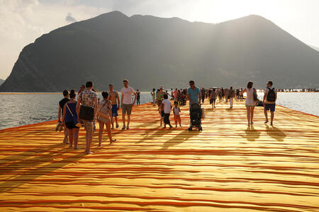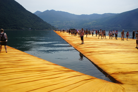 Христо Явашев и Жанн-Клод де Гийебон, временная инсталляция: Плавучие пирсы, 2016 г., озеро Изео в Италии.