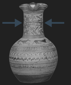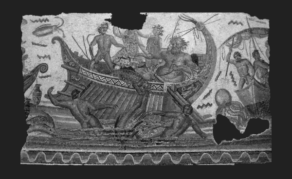 Автор неизвестен, североафриканская римская мозаика: Пантера-Дионис разбрасывает пиратов, II в. н. э., Тунис. Автор неизвестен, ваза с изображением кораблекрушения, конец VIII в. до н. э., Мюнхен.