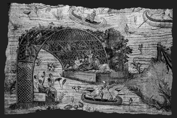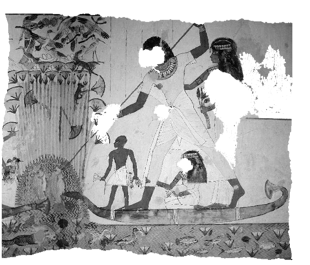 Автор неизвестен, мозаика (фрагмент): Празднование разлива Нила, I век до н. э., Италия. Автор неизвестен, настенная роспись (фрагмент) гробницы Менны: Охота на тилапию, 1397 г. до н. э., Египет.