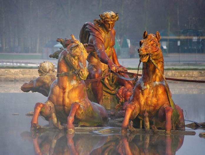 Восходящее солнце — начало нового дня царствования Людовика, четыре коня — времена года, подвластные королю, а тритоны — его прославление.